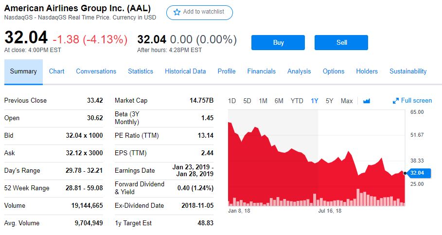 同日,美国最大的航空公司:美国航空(American Airline)也下调了第四财季的盈利指引,引发美股航空股集体重挫。