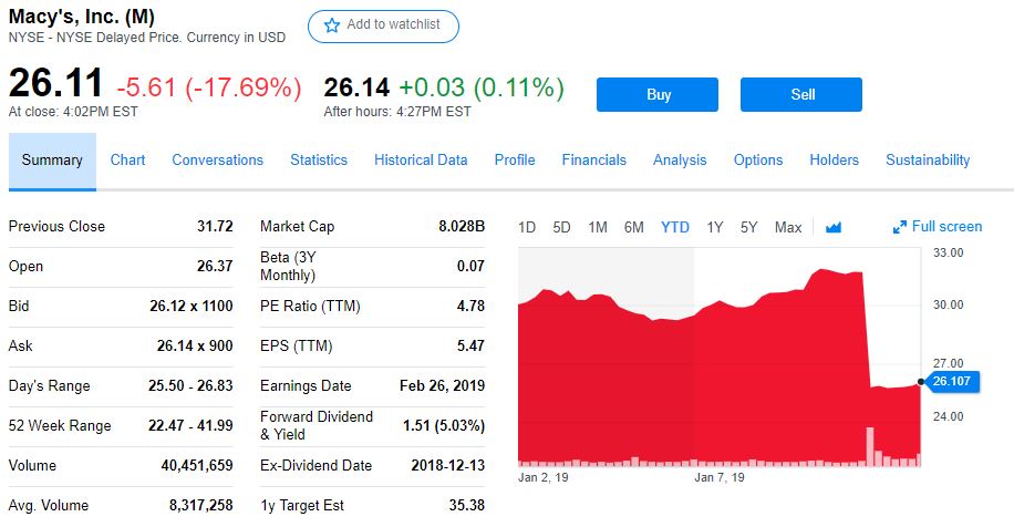 最终梅西收跌17.69%,据NBC统计,这创下公司上市以来历史第二深的单日跌幅纪录;收报26.11美元,创2018年2月初以来最低,也接近52周新低22.47美元。