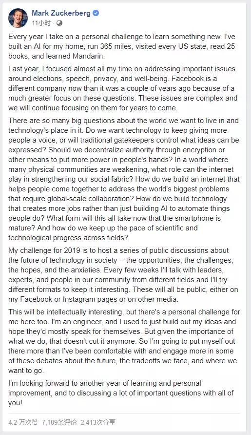 在过去的几年里,他曾提出过诸如每天戴领带、学习普通话、走遍美国等不痛不痒的计划,还在2018年年初煞有介事地对外表示要“修复 Facebook 的问题”。但很显然,这番言论 Flag 立得飞起,去年的 Facebook 走得并不顺。