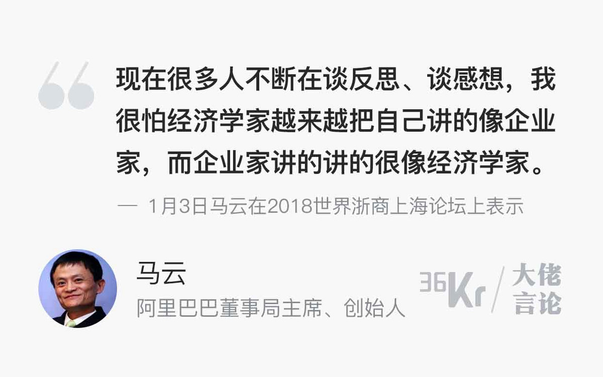 马云称,“现在很多人不断在谈反思、谈感想,我其实很怕经济学家越来越把自己讲的像企业家一样,而企业家讲的讲的很像经济学家。”(演讲全文)