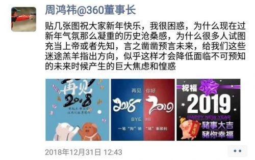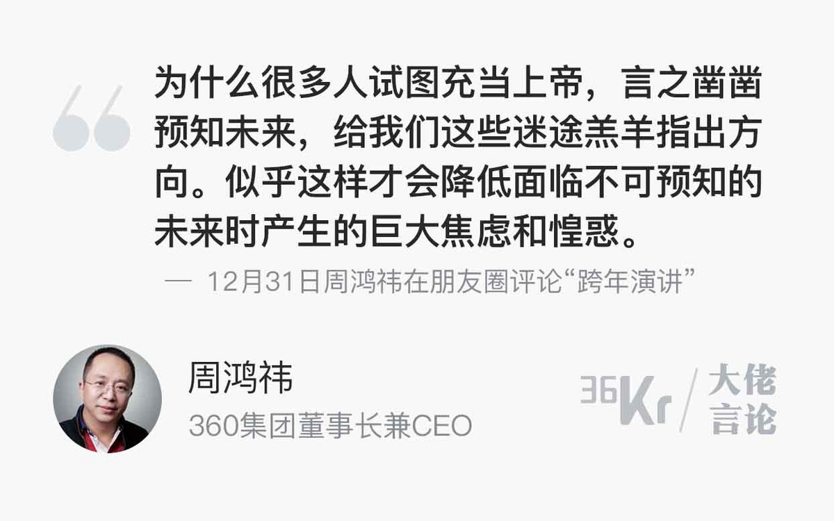 12月31日,周鸿祎发朋友圈评论了跨年演讲,他自称是“迷途的羔羊”,并表示,“为什么现在过新年气氛那么凝重的历史沧桑感,为什么很多人试图充当上帝或者先知,言之凿凿预知未来,给我们这些迷途羔羊指出方向,似乎这样才会降低面临不可预知的未来时候产生的巨大焦虑和惶惑。”