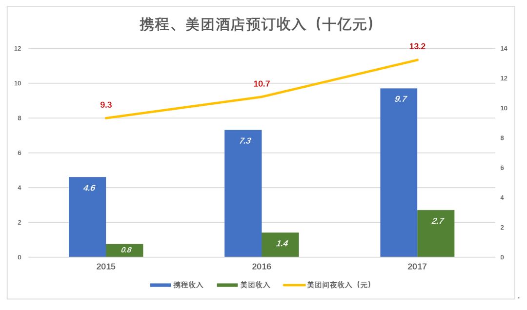 但值得欣慰的是,携程住宿业务的收入远远高于美团。2017年携程住宿业务收入97.1亿,同比增长32.8%;美团酒旅预订收入27.1亿,同比增长91.3%。