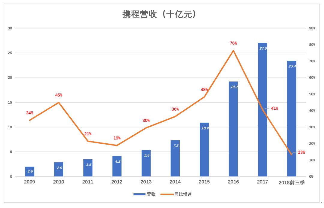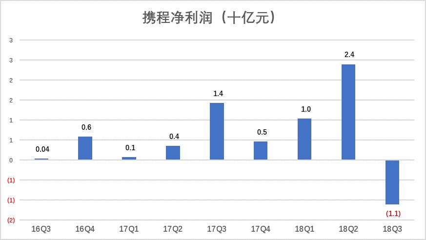 2016年携程营收同比增长76%,2017年增速跌至41%,这也不足为奇,毕竟吞并艺龙、去哪儿网只能产生“一次性功效”。但2018年前三季营收同比增幅仅13%就值得警惕了,显然与美团点评、飞猪的崛起有关。