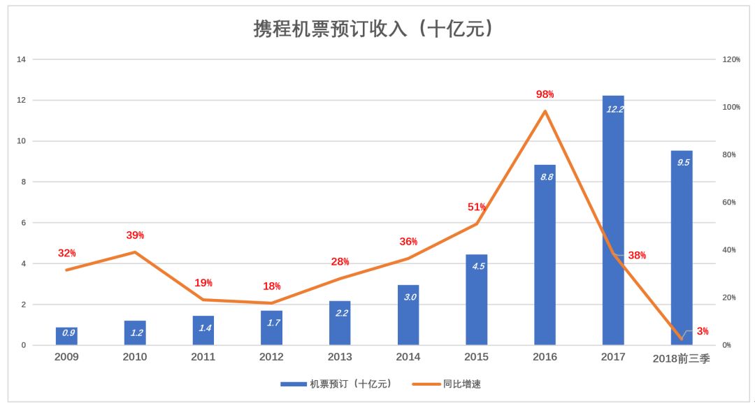 携程另一项主要业务——交通票(主要是机票预订)也正在“失速”。2016年,受并入去哪儿网的影响,携程交通票收入大涨98%;2017年增幅跌至38%,2018年前三季增幅仅为2.5%。