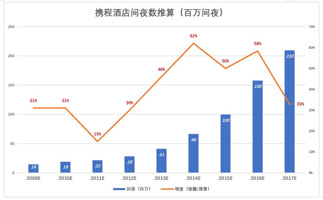 携程早已不在财报中披露酒店预订间夜数,只公布同比增速,2016年连增速也隐了。根据早年公布的数据及增长率推算,2015年携程酒店间夜数约为9960万,2017年突破2亿。携程增速惊人,但美团酒旅更加凶猛,2017年前三季就达到2亿。关于携程何时被超越,外界未取得共识。有分析认为美团酒旅间夜数2016年就已超过携程,或许这正是携程不披露同比增速的原因。