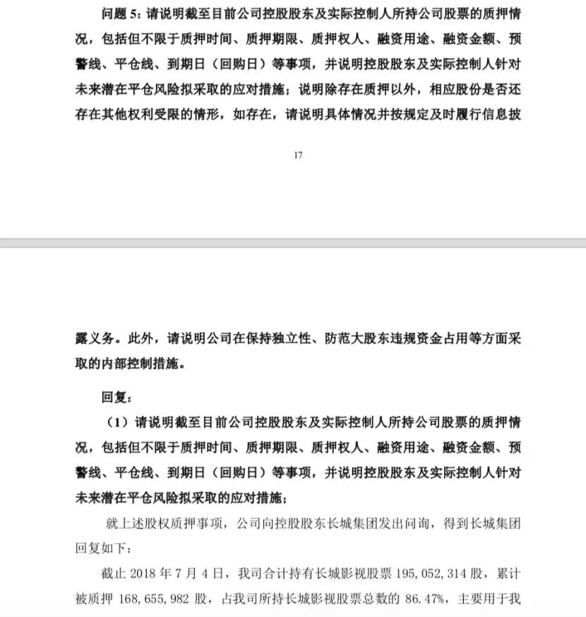 在2017年年报问询函中,深交所要求长城影视说明控股股东及实际控制人所持公司股票的质押情况,以及针对未来潜在平仓风险拟采取的应对措施等。