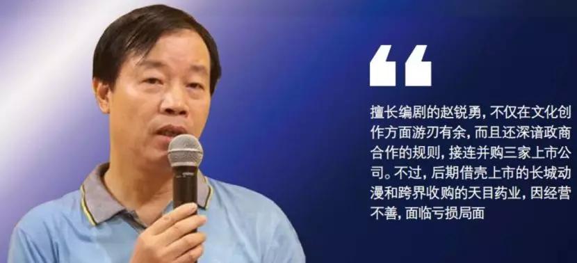 自从长城影视完成借壳上市后,实际控制人赵锐勇在公司业务发展上有所懈怠,转而热衷于资本运作,又控制了长城动漫、天目药业2家上市公司,打造出闻名一时的“长城系”。在2016年胡润中国百富榜上,赵锐勇、赵非凡父子以34亿身家名列第1238位。