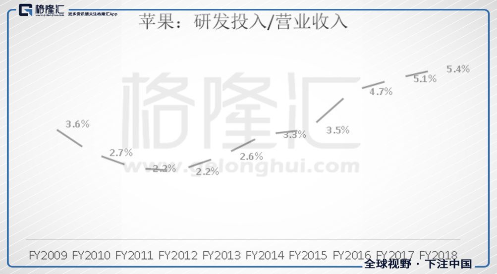2018年,苹果公司的研发强度(研发投入/营业收入)为5.4%,过去10年的平均值为3.5%;(高通2018年的研发强度为25%,过去10年的平均值为22%)