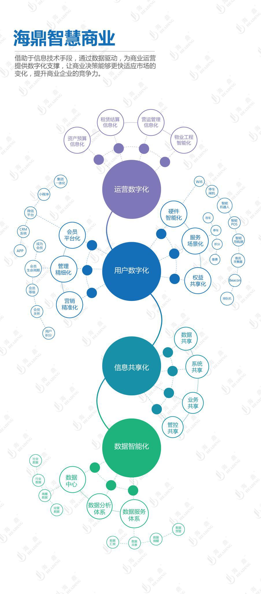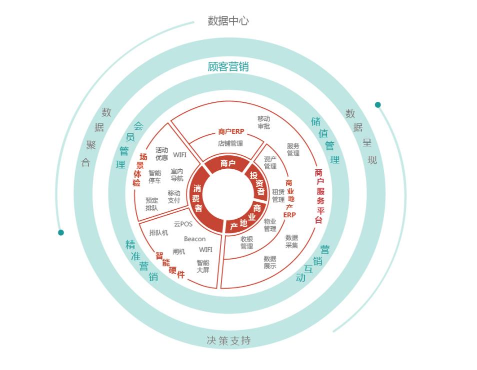 针对行业对于信息化建设升级的渴求,海鼎浓缩近三十年的商业地产信息化服务经验,凝练出了一套满足商业地产营运全流程的智慧商业全解决方案。