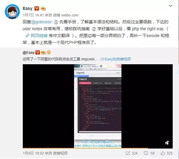 微博博主@Easy 对于前端“革命”的这一命题就表示,了解了语法和结构、主要函数,再补一下 Swoole 和框架等,基本上就是一个现代 PHP 程序员了。