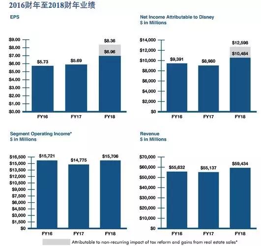 根据官方披露的文件显示,2005财年至2018财年,迪士尼的利润的年复增长率为13%。2017财年,迪士尼的全年营收为551.37亿美元,净利润89.8亿美元。2018财年,迪士尼实现大反转,总营收增至594亿美元,同比上升8%,净利润126亿美元,同比上升40%。