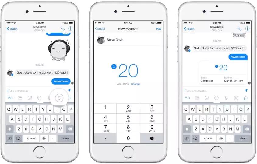 一、支付:2015年推出Messenger的支付功能,限于朋友间的转账支付