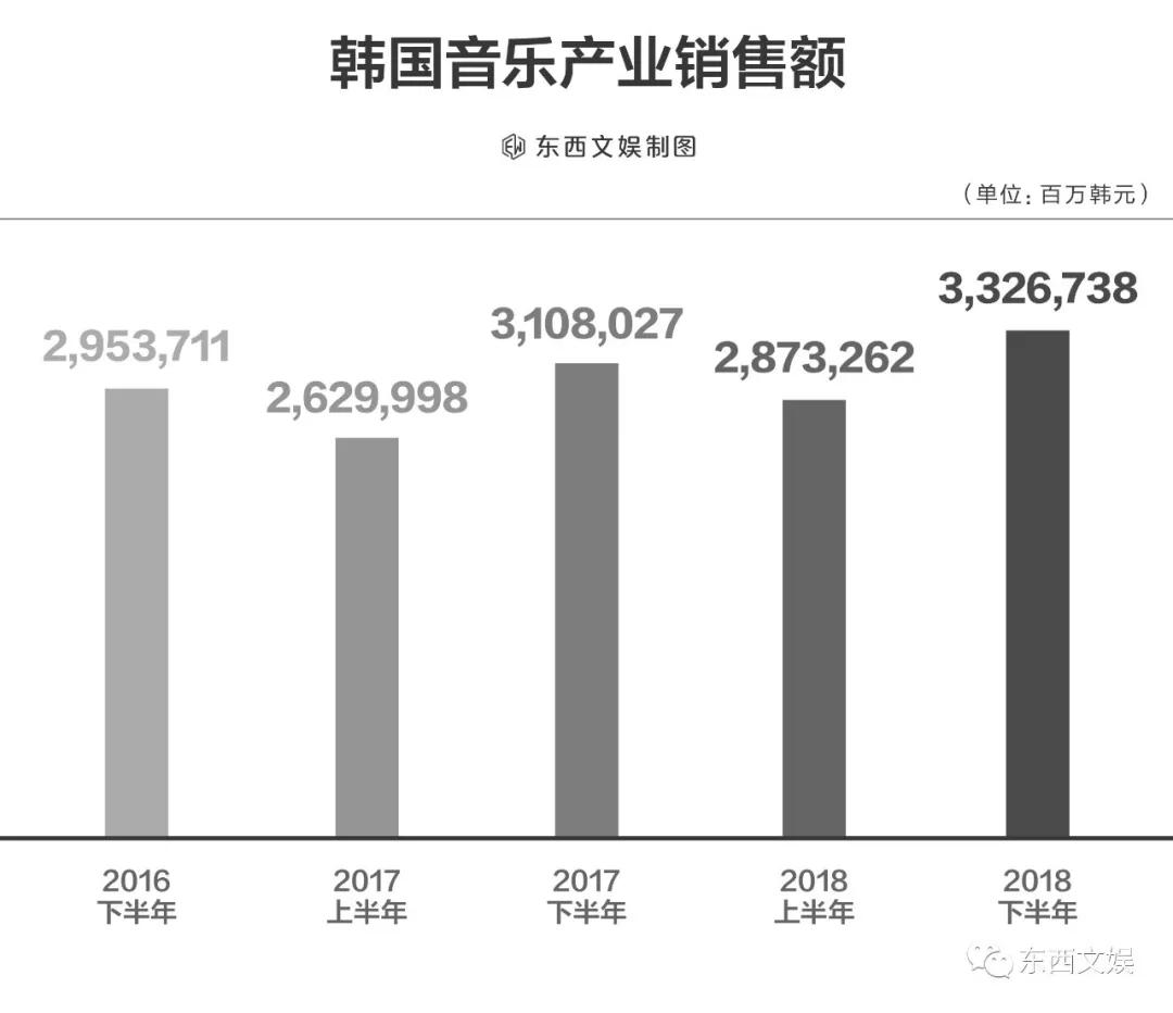 根据韩国文化体育观光部的数据统计,2018年整个韩国文化产业销售额达到了116.4兆韩元(约7161.14亿人民币)。其中,以偶像组合、偶像歌手为主的音乐产业销售额为6.2兆韩元(约381.43亿人民币),同去年相比增长了7.2%,近五年的平均增长率为7.5%。