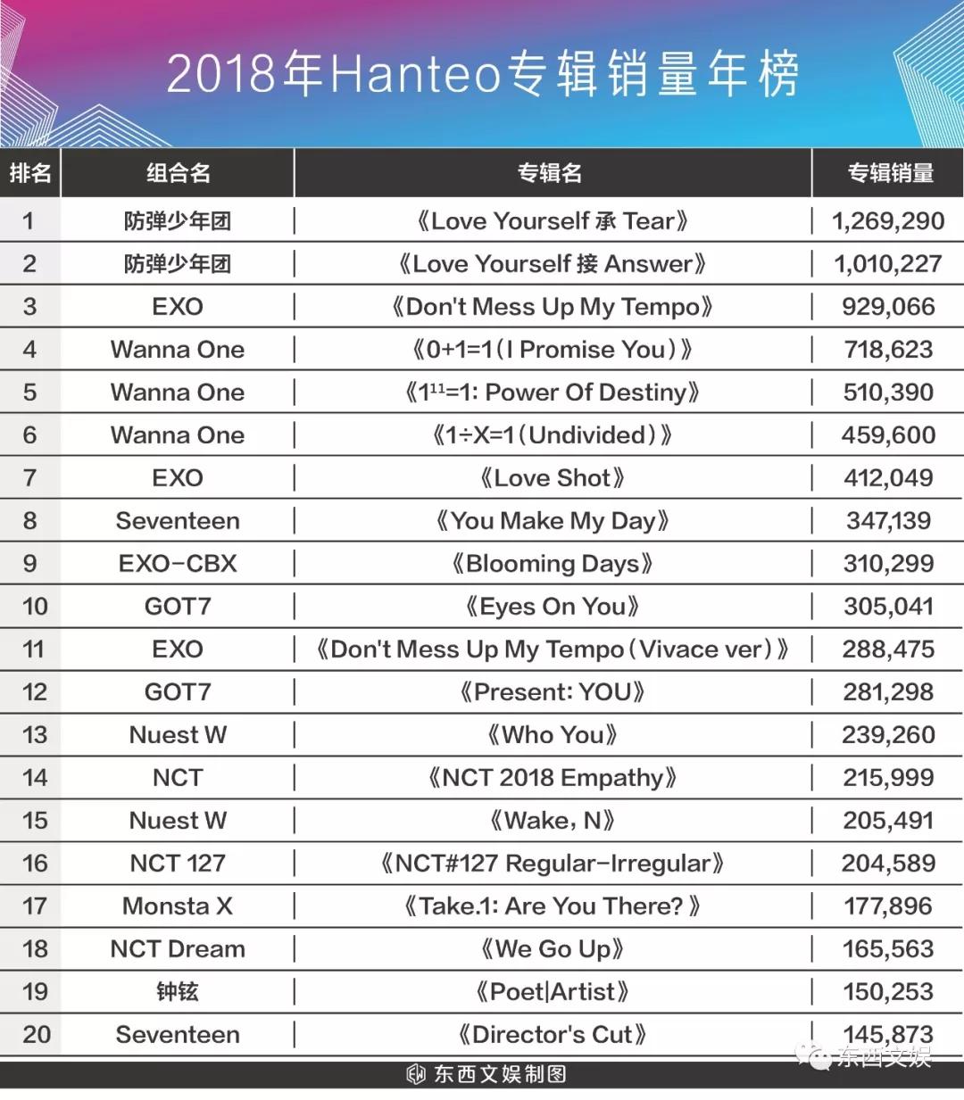 首先,根据Hanteo发布的专辑销量年榜可以看到前十名几乎被防弹少年团、EXO以及Wanna One包揽,尤其是防弹少年团在2018年发行的两张专辑销量均超过100万张。此外,还应注意到出现在专辑销量年榜前20名的组合均为男团,其中“三大”及Bighit四家公司推出的男团在前20名中占据12个席位。