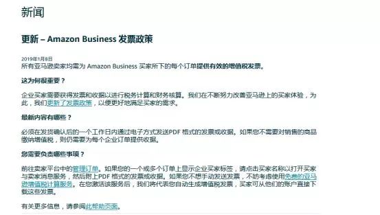 近日,据多位亚马逊欧洲站及美国站卖家向雨果菌反映称,收到了来自平台关于Amazon Business发票政策邮件,自2019年1月8日起,亚马逊要求所有卖家均需为Amazon Business买家所下的每个订单提供有效的增值税发票。