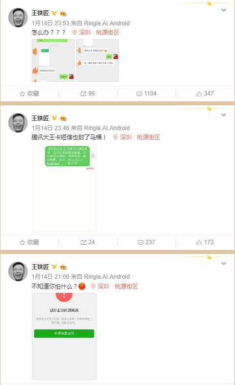 1月14日深夜,前快播创始人、现云歌人工智能科技有限公司(下称“云歌人工智能”)CEO王欣在个人认证微博上连发三条消息,控诉其公司开发的匿名社交产品“马桶MT”遭到屏蔽。根据王欣的截图,目前“马桶MT”的分享链接已遭微信屏蔽,页面显示“已停止访问该网页”;腾讯大王卡短信也被曝封了“马桶MT”。