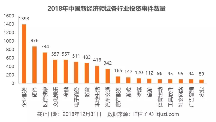另外,在互联网红利消失之际,资本关注行业的变化也同样具有特点。2018 年我国新经济领域获投数量 TOP3 的行业分别为企业服务、硬件、医疗健康领域。