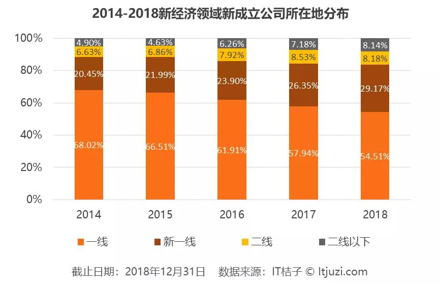 人力成本当属北上广深最为高昂,近年来非一线城市创业补贴力度加大对创业者的吸引力逐渐加强。IT 桔子数据库显示,新经济领域选择一线城市创业的公司近五年来逐年减少,已从 2014 年的 68% 下降至 2018 年的 54.51%。相对应的,新一线城市 5 年以来比重提升了 8% 左右。随着创业公司向下延伸带来的产业多样化,新一线与二线城市的工作机会逐渐增多,伴随着各地人才吸引政策的相继出台,我国创业地域分布结构将更加均衡健康。
