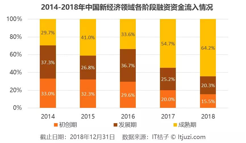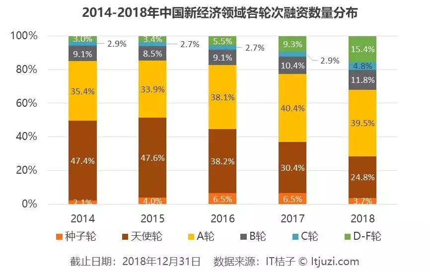 资本谨慎性的提升从近五年新经济领域融资事件所处阶段的变化上也可窥得一二。虽然动辄听说某个基金天使投资获数百倍盈利的神话,但是早期投资风险之高素来是九死一生之事。尤其是当社会上好项目逐渐变少之时,资金也逐渐收紧的投资者们对早期项目的总体投资数量一定是减少的。
