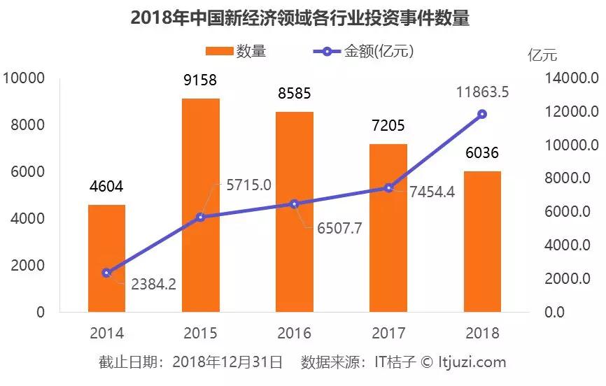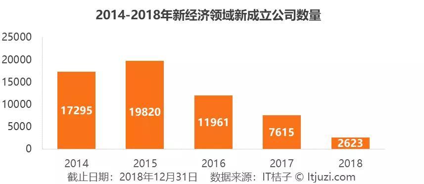 IT 桔子监测到新经济领域在 2018 年诞生了 2623 家企业,同比减少 66%。虽然由于 IT 桔子创业数据爬取规则的原因,这一部分的数据不太详尽,会存在延迟的状况,但是整体上可以看到中国新经济领域创业从 2015 年达到高峰之后的逐步下降。