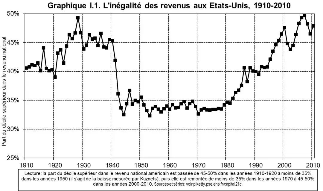 美国收入前10%人群的收入占美国国民总收入的比重从1910-1920年的45%-50%下降到1950-1970年的不足35%,但从80年代开始,这一比值持续上升,到2010年已重回50%的高峰。[1]