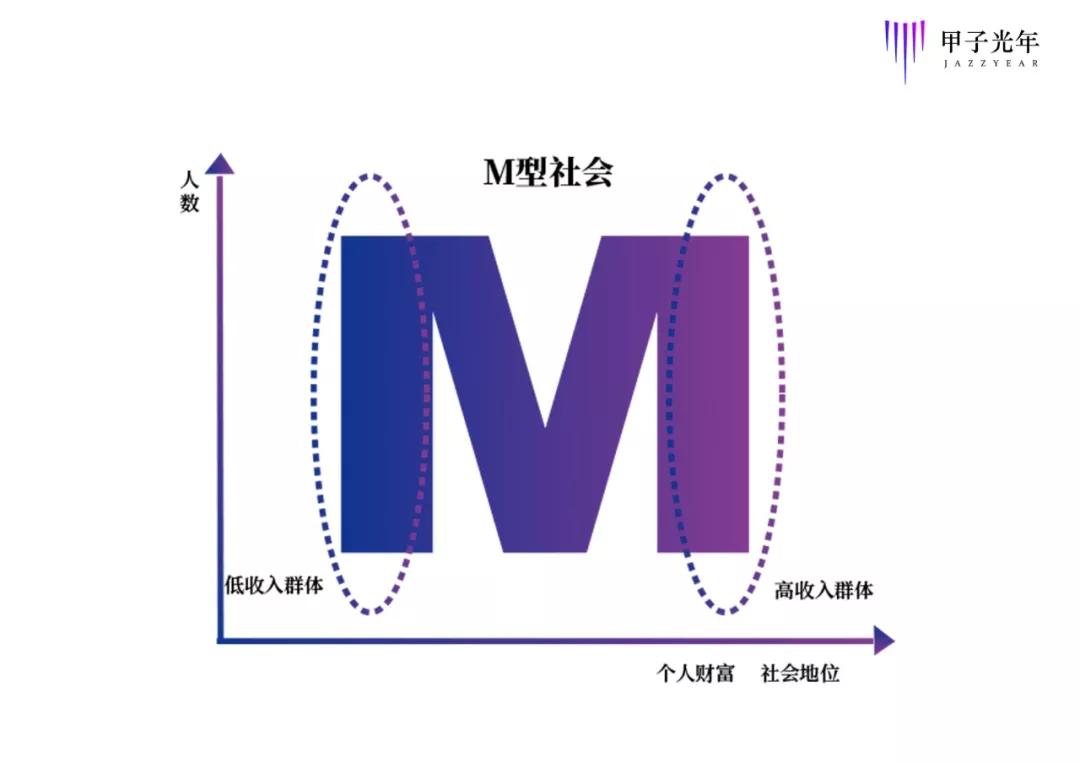 简单来说就是富人愈富,中产愈下:在经济由高速增长转为趋缓甚至衰退后,资本回报的增速远远大于劳动回报,更少的人集中了更多财富,中产却出现分流——仅少部分人能从中层跻身富裕阶层,大部分则沦为中下收入阶层,中间群体出坍缩,社会财富的人口分布结构从“A”型走向“M型”。