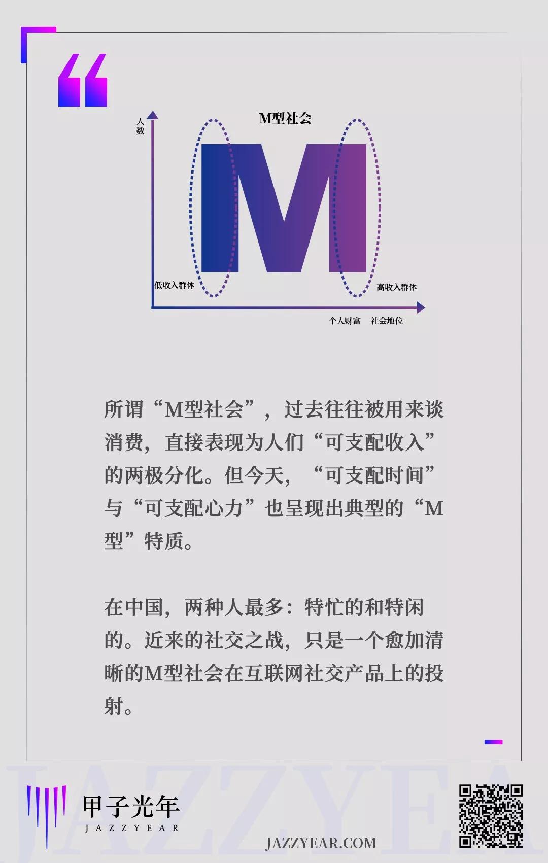 人们有“可支配收入”,也有“可支配时间”和“可支配心力”。M型人口结构影响的不仅是消费行为,还有人们对社交产品中的偏好和使用习惯。