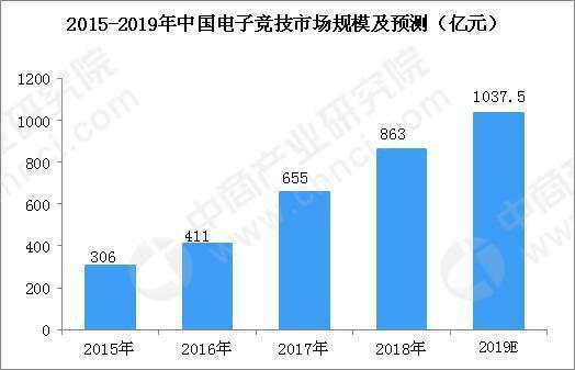 据中商产业研究院发布的《2015-2019年中国电子竞技市场规模及预测》报告显示,2017年市场规模为655亿元,2018年为863亿元,预计2019年市场规模将达到1037.5亿元。通过数据来看,未来的电竞市场还是有一定增长潜力。