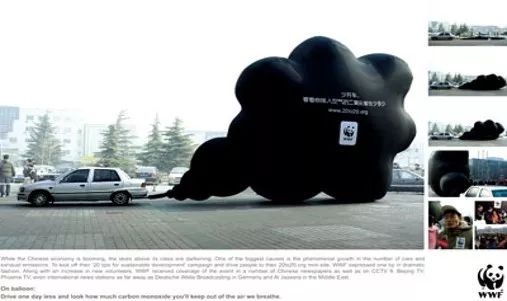 2007年,世界野生动物保护基金会将一个巨大的黑云形状气球,放置在车尾,并连接在汽车排气管上。