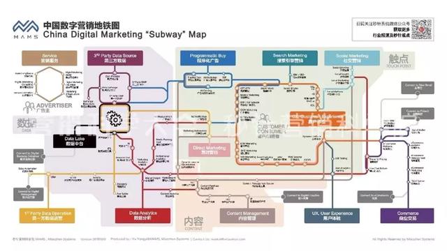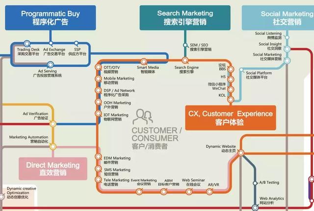 因此,在技术层面,数字营销解决的是数据、内容、触点三个板块的连接、管理和优化,之后所有技术领域和节点都是围绕这个命题展开。地铁图把所有数字营销的运作环节分类成: