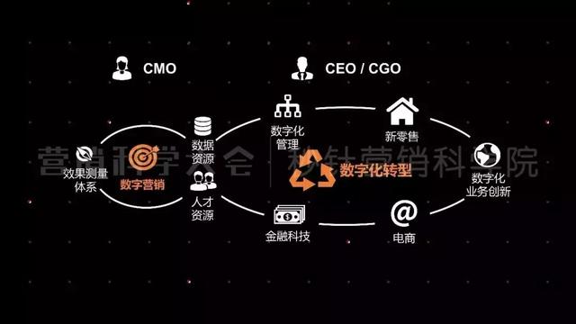 除了提升营销效率,CMO(首席营销官)负责的数字营销也是由更高层面的CEO/CGO(首席增长官)牵头的数字化转型的重要环节,在数字营销运营过程中留存的数据、人才和效果监测体系是企业转型的重要资源。