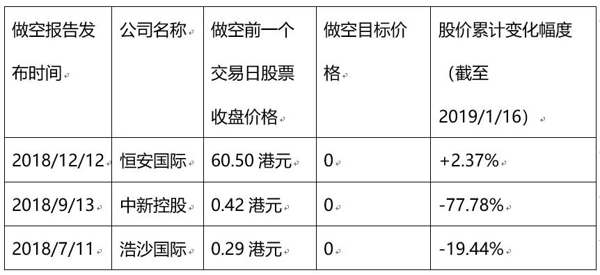 除和信贷以外,博力达思目前为止一共做空过三家中资企业,分别是恒安国际(HKEX:1044),中新控股(HKEX:8207)和浩沙国际(HKEX:2200)。