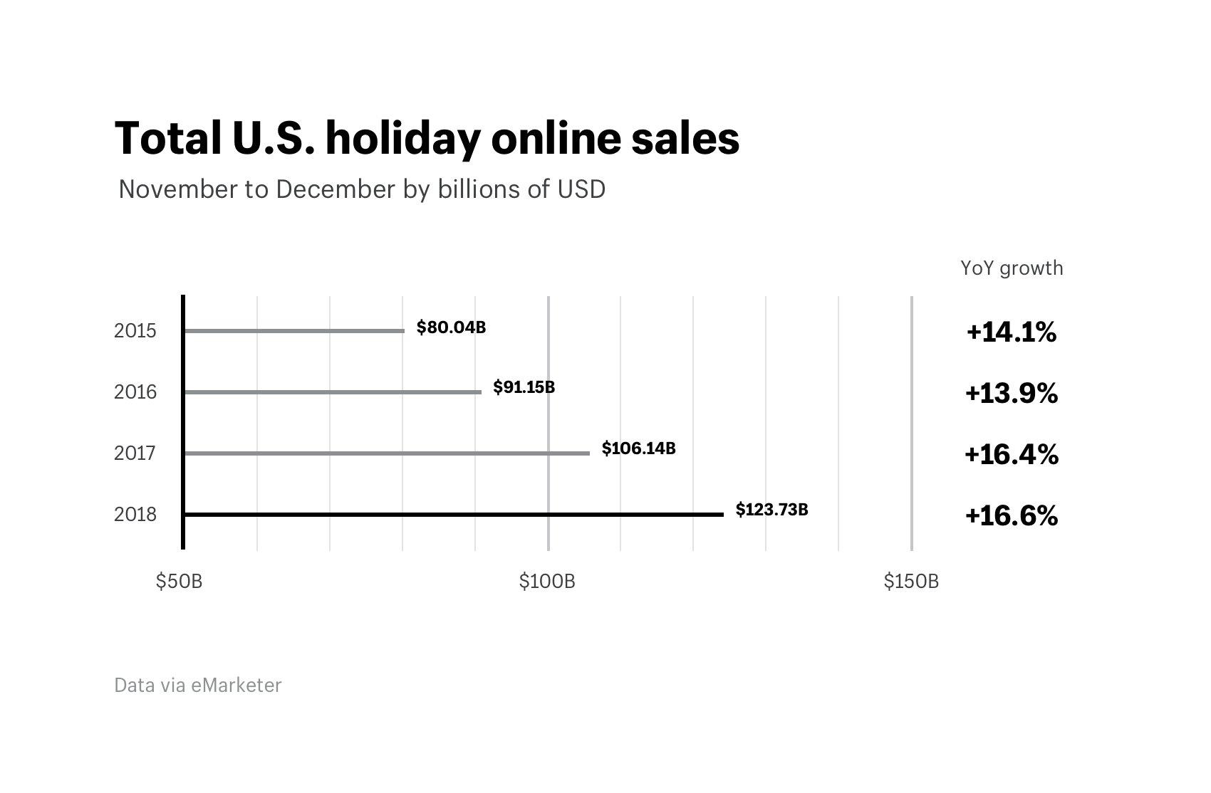 2018年美国购物季线上销售收入如下图所示,2018年同比增长16.6%,而亚马逊占据总收入的38%,是第二名的十倍。自该数据公布以来,亚马逊的股价开始逐渐上涨。
