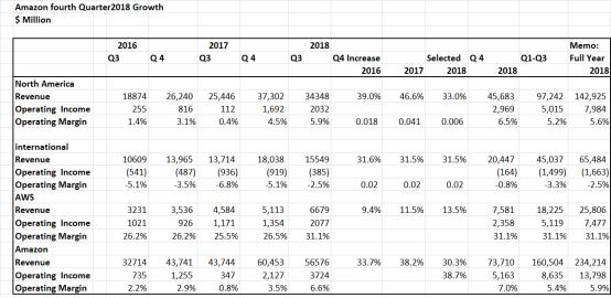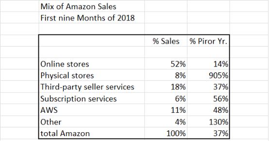 对于一家增长型公司,因为其业务在不断开发、拓展,很难去预测其收入变动,下图就表现了亚马逊的各业务部门的收入变化情况。在2018年前9个月,亚马逊同比增长37%,其中线上收入占总收入的52%,但是同比增长仅14%,而实体超市,包括全食超市、实体书店等,收入增长905%,主要是因为全食超市在2017年没有全年计算。但是,第三方服务收入同比增长与整体增长持平,为37%,要比亚马逊自营收入高很多,收入占比也达到18%。