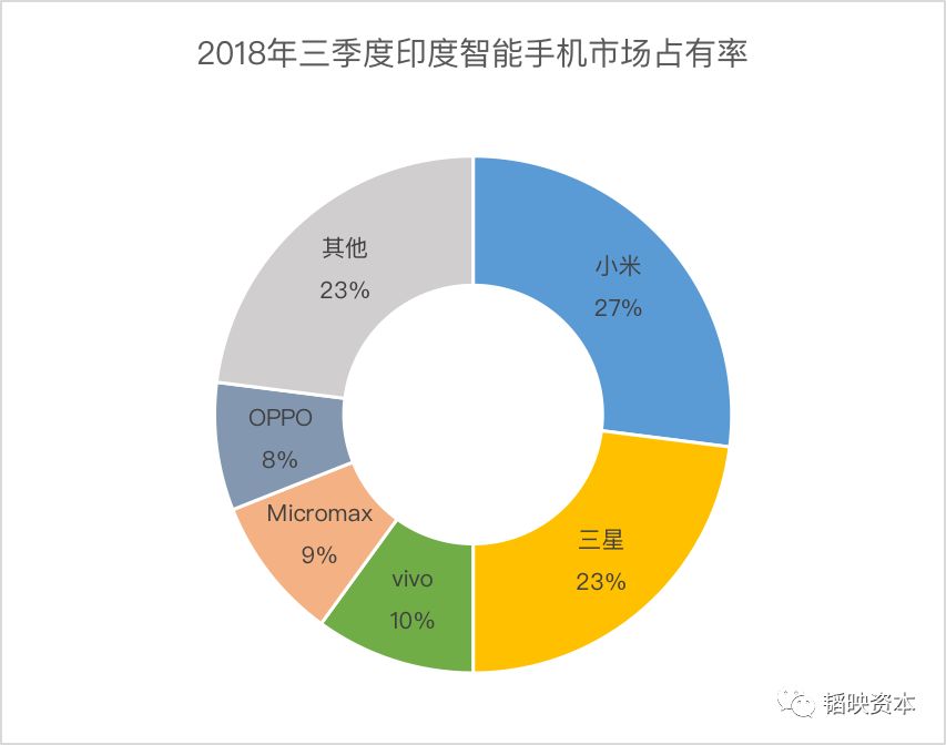 中国手机品牌已经占据了印度智能手机市场一半左右的份额。据市场研究公司Counterpoint Research数据,2018年三季度,小米在印度的市场占有率达到27%,已经超越三星位居榜首;vivo和OPPO分别以10%和8%排名第三和第五。印度本土手机Micromax仅以9%的份额排名第四。