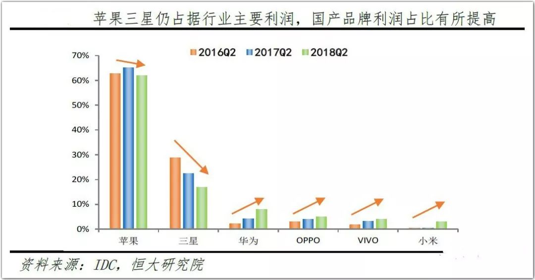 虽然国产手机品牌出货量领先,但在高端手机和品牌溢价方面仍然无法与苹果和三星相抗衡。IDC数据显示,苹果占据了智能手机行业60%左右的利润,国产品牌虽然在近两年抢占了更多市场份额并不断进军高端机型,利润占比有所提升,但与苹果和三星差距依然较大。