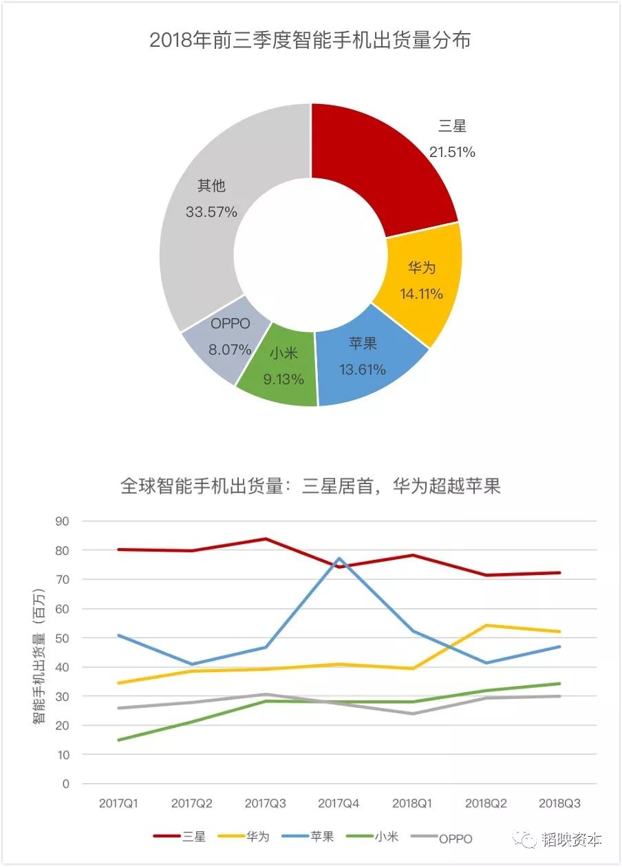 从增量到存量,无疑加剧了手机厂商的竞争。根据IDC数据,2018年前三季度,市场份额居首的三星出货量达2.22亿,同比下滑9.0%;华为出货量逆势上涨29.8%,并在2018年第二和第三季度连续超越苹果,成为全球第二大智能手机厂商;出货量变化不大的苹果则退居第三位,四季度苹果能否借节假日扳回一局,让我们拭目以待;小米的出货量则同比大涨46.5%,稳居第四位。