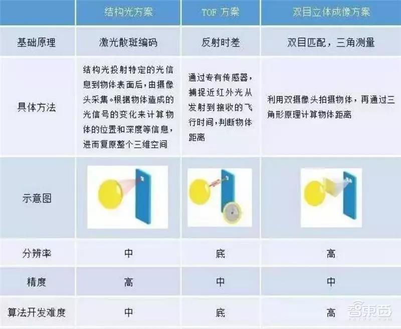 三种主流方案中,比较成熟的是结构光和TOF。其中结构光方案最为成熟,但是极易受到外界光的干扰、响应速度较慢、识别精度较低;TOF则在这几个方面比结构光方案具有一定的优势,因此TOF成为了目前在移动端被看好的方案。基于视差原理的双目立体成像方案抗环境光干扰强,分辨率高,也是移动端可选方案之一。但是纯双目方案当前页存在着在纹理单调的环境中找不到匹配点而失效的缺点。