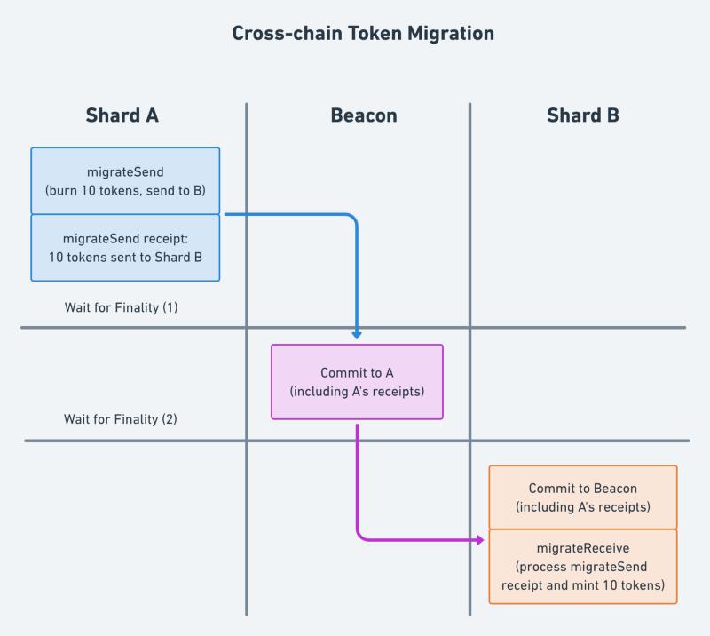 在部署 Token 时(让我们称之为“酷酷的跨分片 Token”或“CCT”),我们将基于 ERC20 添加两个小附加功能——MigrateSend 和 MigrateReceive 函数功能。借助使用 MigrateSend 销毁 Token 并生成收据,其中将包括已销毁的 Token 和接收的分片。之后,通过调用 MigrateSend 来销毁一个分片上的 Token,然后在另一个分片上调用 MigrateReceive 来有效地进行 Token 转移。