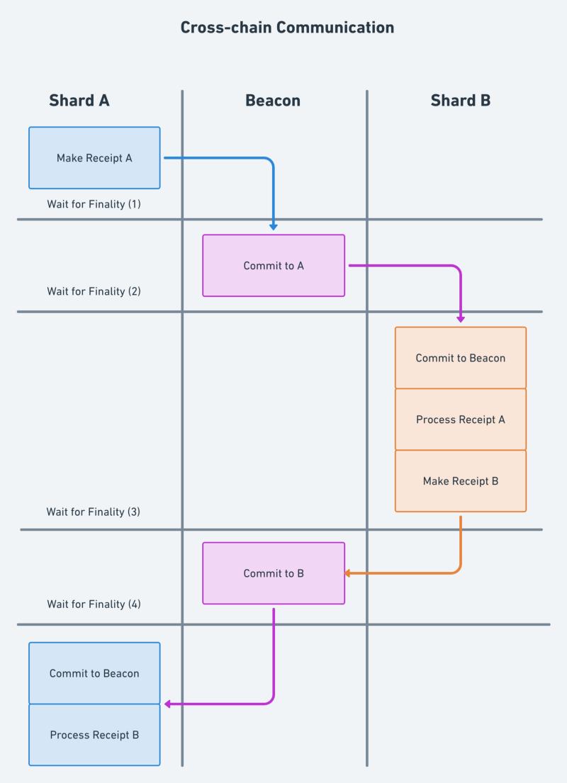 相反,当分片 A 上的用户或合约想要与分片 B 进行交互时,分片 A 会生成带有该交互消息的“收据”。分片 A 在其块头中提交其所有收据,信标链再等待 A 确认完成后,将提交至分片 A 的块头(包括对收据的提交)。分片 B 也必须等待信标的最终确认,之后提交至信标块头。