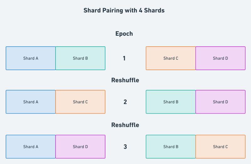 分片配对是一个简单的解决方案。在文章的第三段中就已经提到,我们在每个高度将分片混合成同步对。每次一个分片与另一个分片进行配对时,任一分片的用户都可以跨越这两个分片执行紧密耦合的状态更新。如果分片 A 和 B 在高度 7 处配对,则 A 和 B 的所有验证者必须知道 A 和 B 的全部状态,并且分片必须一起前进或根本不前进。