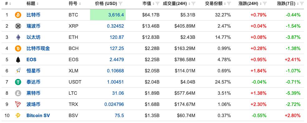 比特币 BTC 报 3616.4 美元,7 日内涨跌幅 -0.44%;
