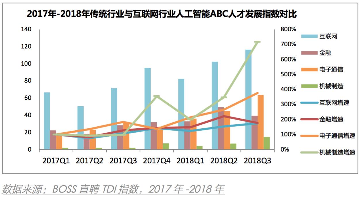人工智能人才需求在经历了2017年和2018年上半年“概念式”似的爆炸式增长后,在2018年第三季度有了新的变化:虽然互联网仍然是人工智能人才需求的主导行业,但传统行业AI人才发展指数大幅增长,需求增速明显加快,其中较为突出的是电子通信、金融业和机械制造业,机械制造业2018年三季度指数较2017年一季度翻了7倍,同比增幅超300%。