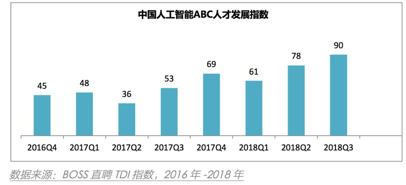 2018年人工智能人才市场进入高关注、高需求、高发展的阶段,人才需求同比2017年增长3.6倍。报告显示,2017年ABC人才需求同比2016 年激增4.7 倍;2018 年前三季度人才需求延续了2017 年的强劲增长态势,增速小幅降至3.6 倍。