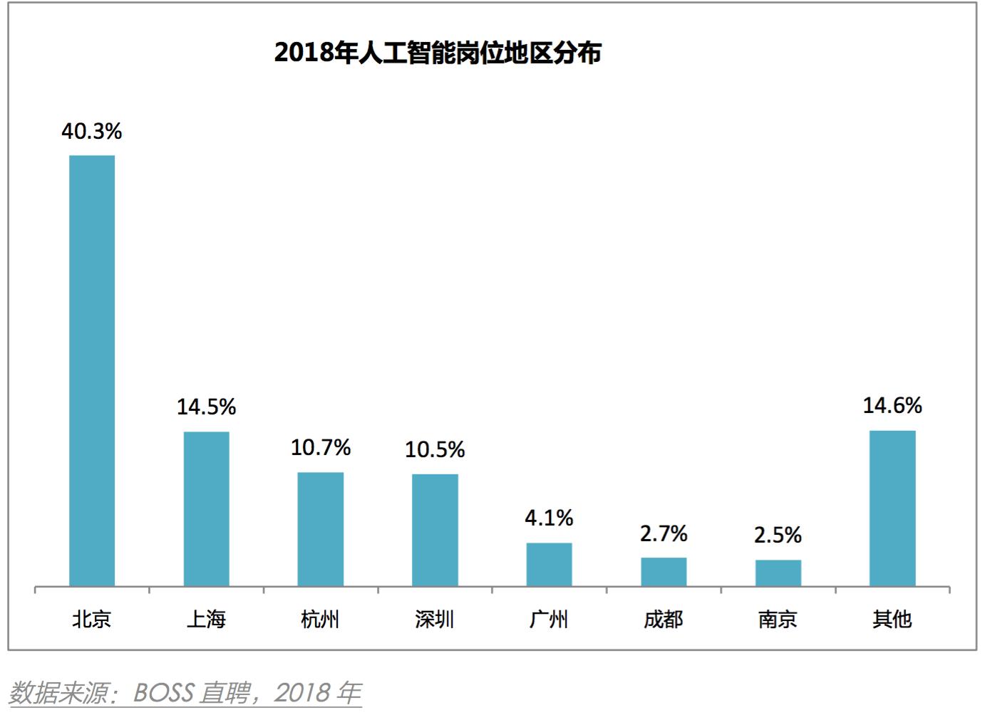 BOSS 直聘数据显示,2018 年八成人工智能岗位集中在北京、上海、杭州、深圳和广州五大城市。北京以40.3% 的占比遥遥领先,较其他城市有数量级优势;上海以14.5%位列第二;杭州借助数字化经济的快速崛起,以10.7%排名第三,略领先深圳。而其他城市人才储量则与前5 名形成巨大差距,大部分城市AI 人才储量占比不足0.5%。