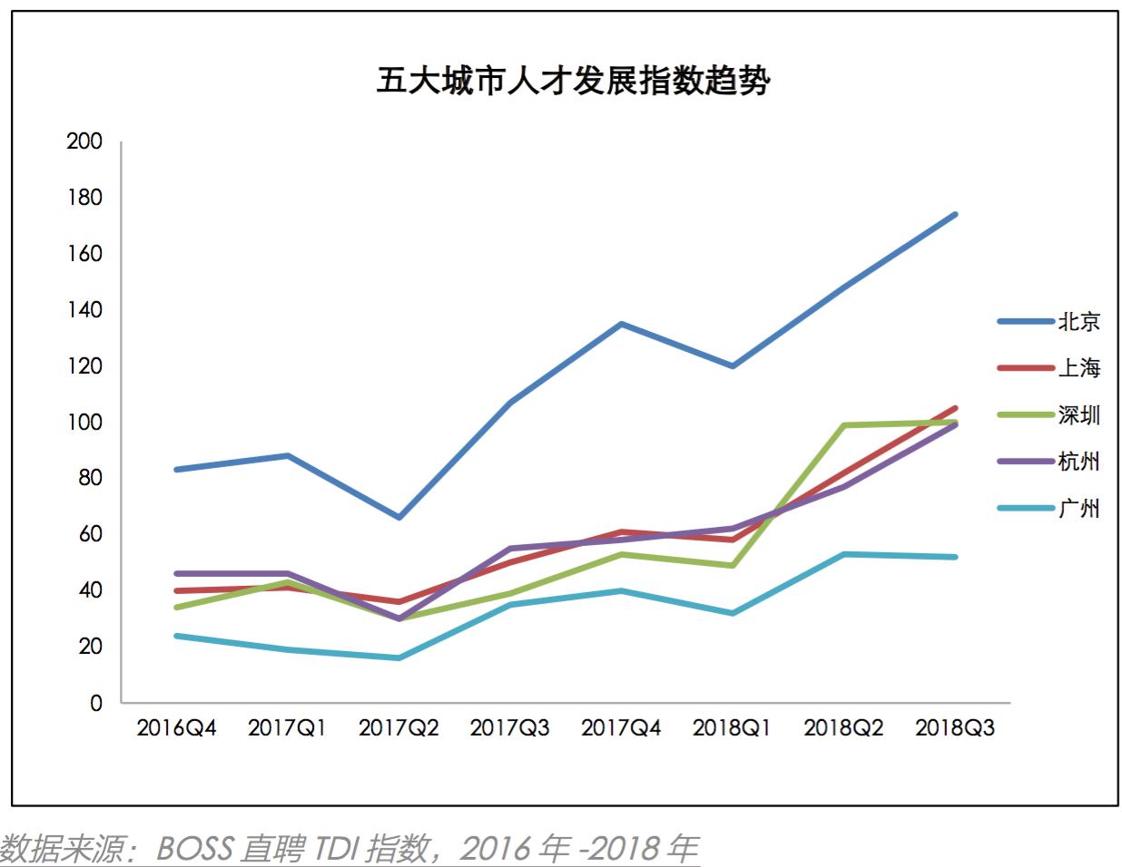 AI人才发展指数也同样反映这种城市分布特征。根据《中国人工智能ABC人才发展报告》显示,北京的人工智能人才发展指数以绝对优势领先于其他四个城市。北京是中国人工智能的发展中心,集政策、人才、研发、区位等多重优势于一体。