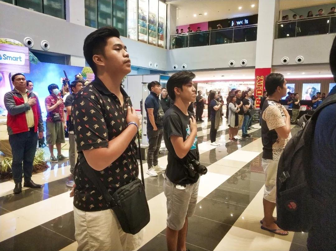 在公众集会前演奏国歌是菲律宾的惯例,电竞比赛并不例外。全场观众都安静下来,立正挺胸,右手抬起,手掌紧贴胸口,行注目礼。