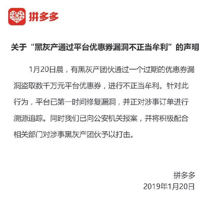 1 月 20 日晨,有黑灰产团伙通过一个过期的优惠券漏洞盗取数千万元平台优惠券,进行不正当牟利。针对此行为,平台已第一时间修复漏洞,并正对涉事订单进行溯源追踪。同时我们已向公安机关报案,并将积极配合相关部门对涉事黑灰产团伙予以打击。