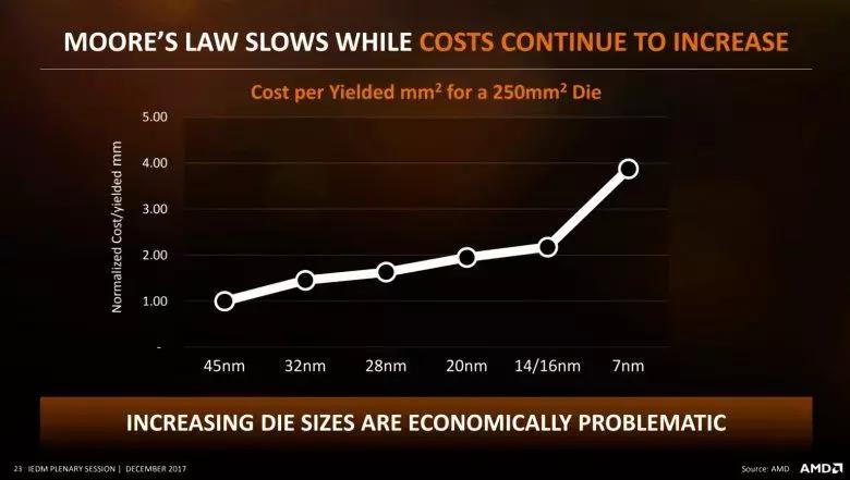 根据 AMD 在 IEDM 会议上的资料,若将生产 250 平方毫米的 45nm 芯片的生产成本定为基准 1,14/16nm 芯片的成本将达到 2,而生产 7nm 芯片的成本更将翻倍达到 4。