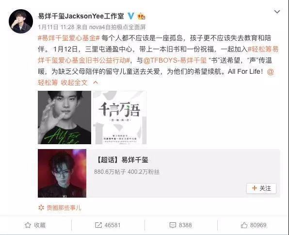 1月11日中午,易烊千玺工作室官方微博发布了一条公益内容,邀请人们带一本旧书在次日前往北京三里屯通盈中心参加活动,微博最后@了深耕公益领域的健康保障平台——轻松筹。